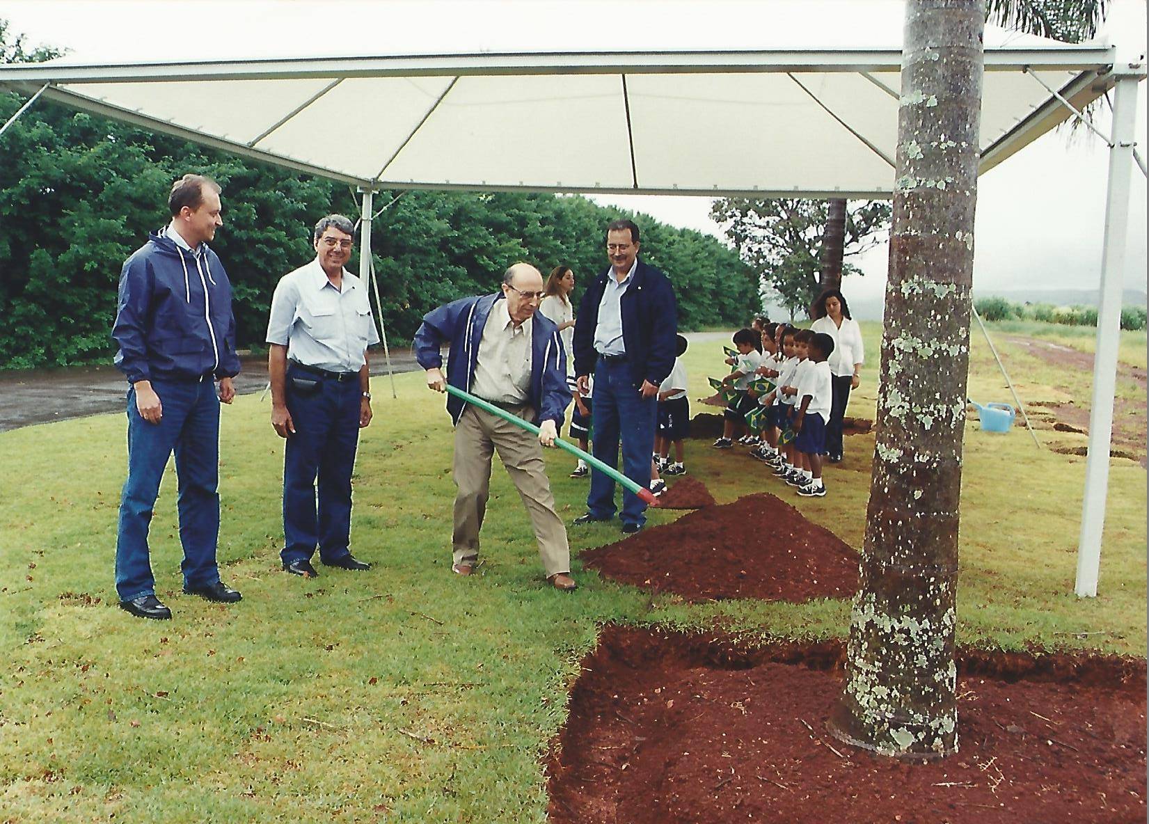 Na foto Cláudio Dutra planta uma árvore no Barreiro, Araxá, para comemorar os 50 anos da descoberta do Nióbio. Estavam presentes os dirigentes da CBMM em 10 de maio de 2003.